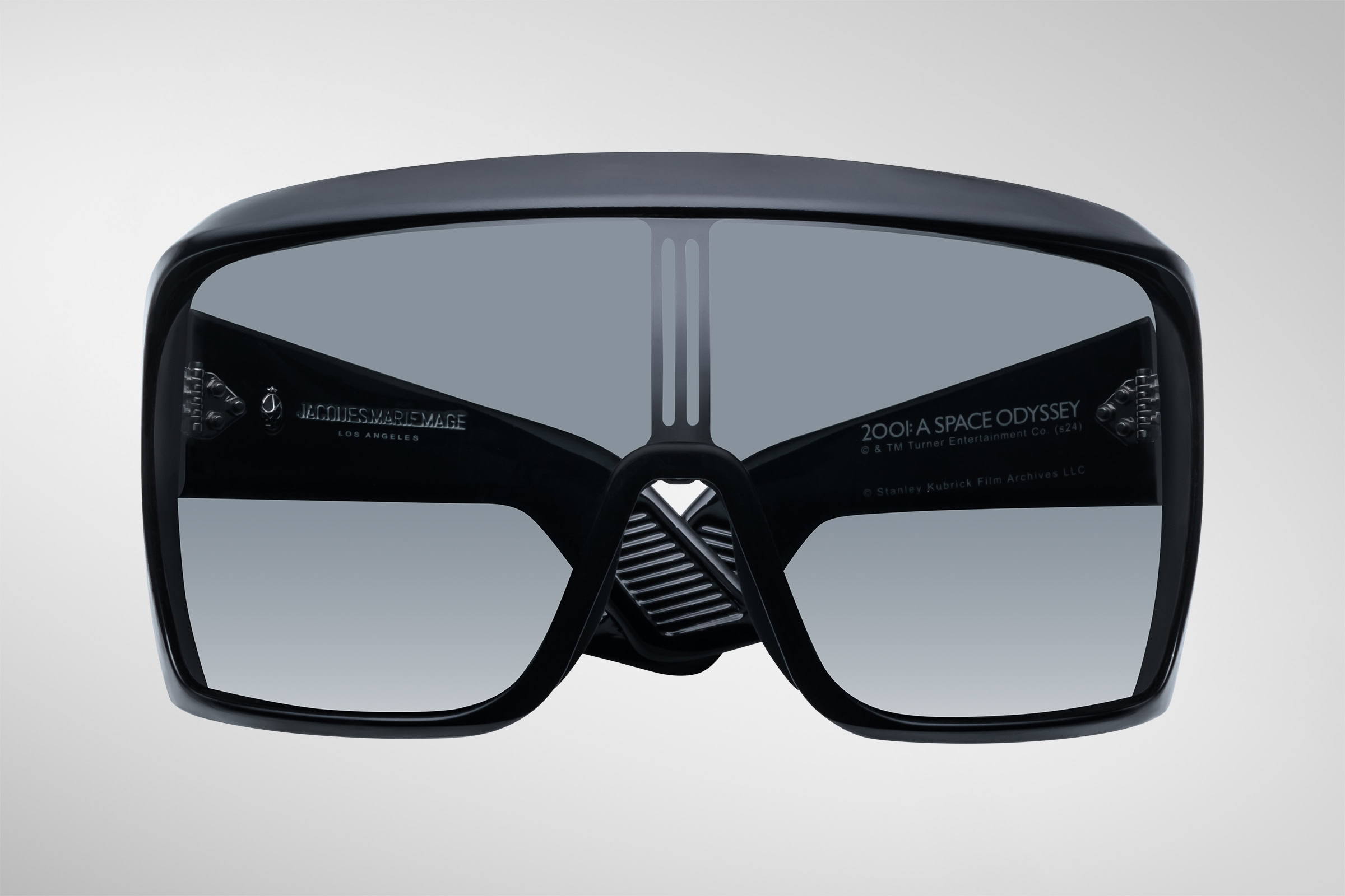Riffing off the helmets in 2001: A Space Odyssey, these oversized sunglasses have been made in Italy from black acetate and feature signature spur-shaped rivets.