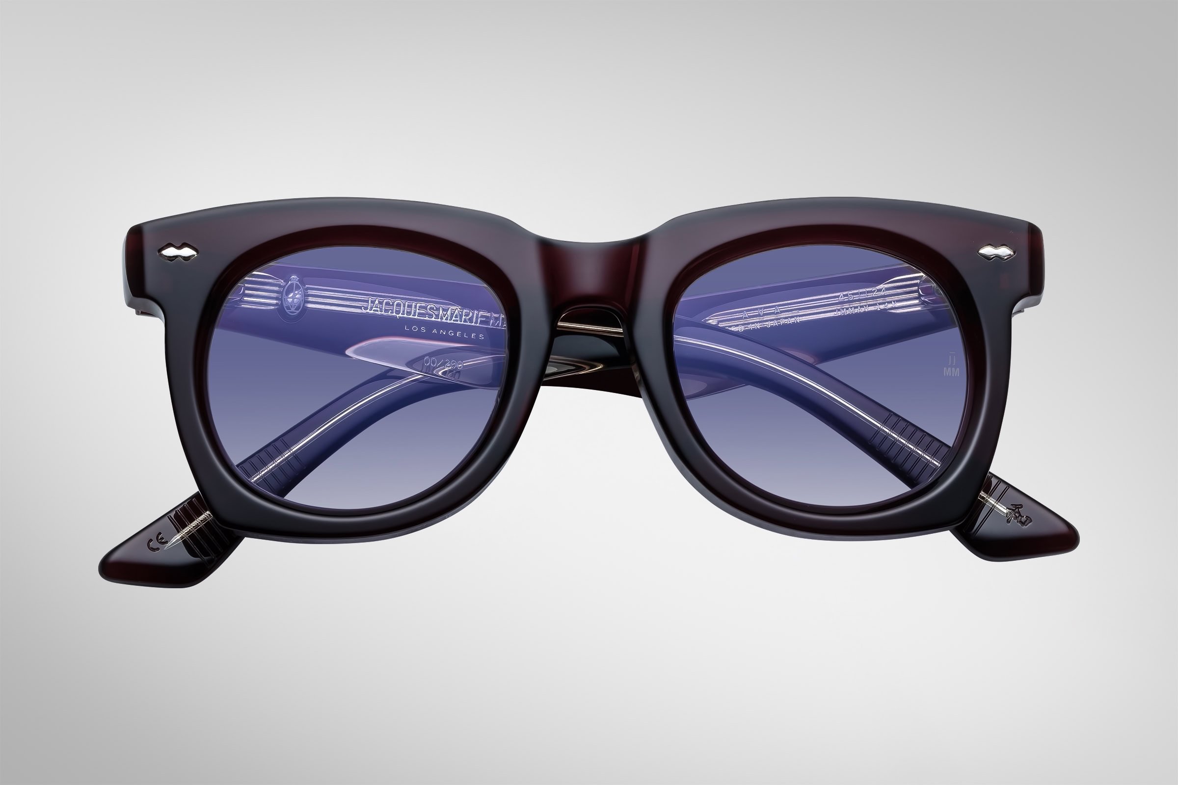 Sleek fifties inspired glasses with graceful lines, signature double-arrowhead front pins, and custom double-laminated temples with refined ‘Lever’ wirecore.