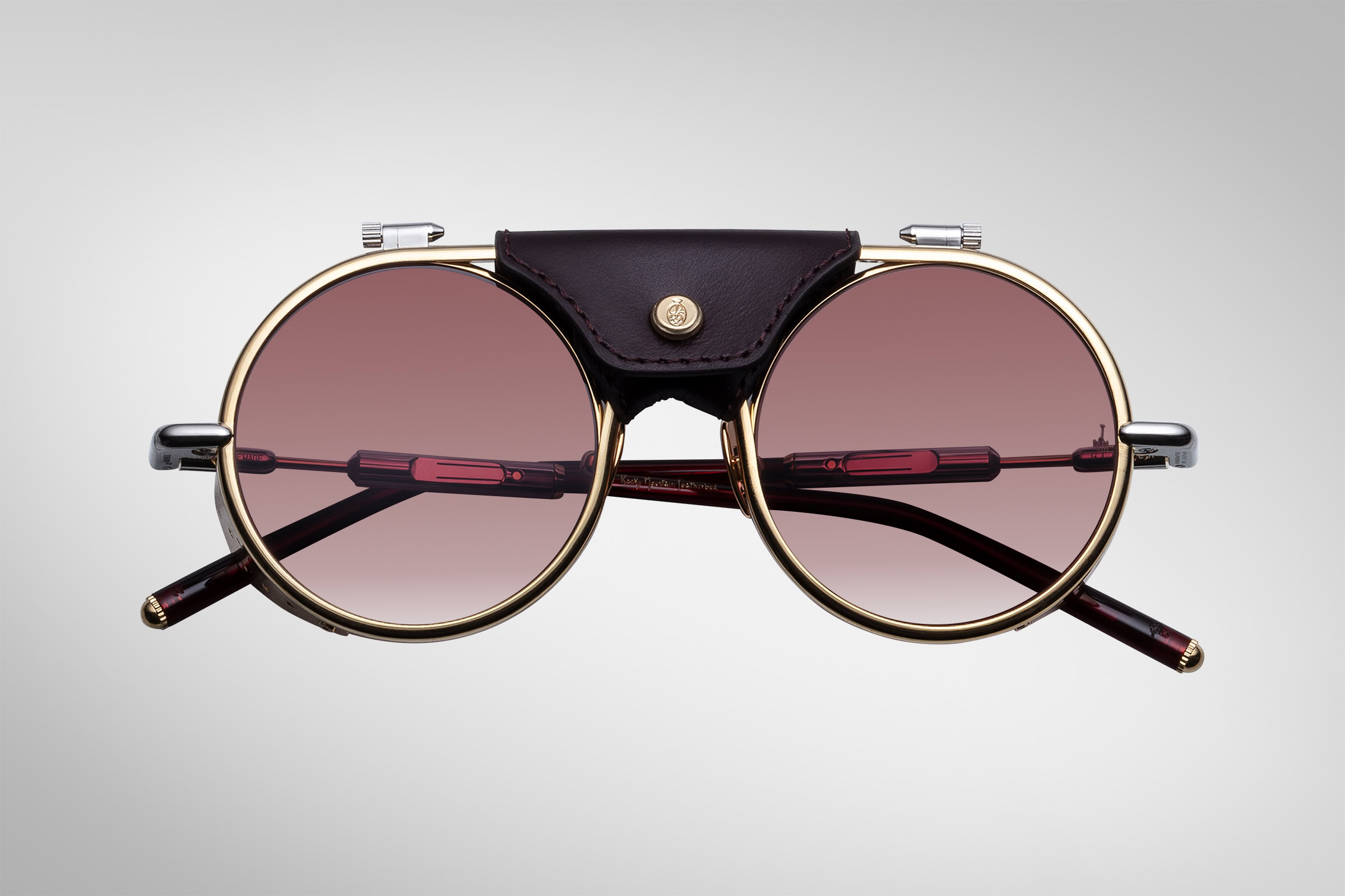 Classic alpine spectacles reimagined for the Rocky Mountain Featherbed for Jacques Marie Mage collection, handcrafted from 100% beta titanium with perforated eye shields, a leather centrepiece secured by a beveled snap, and interchangeable temple options.