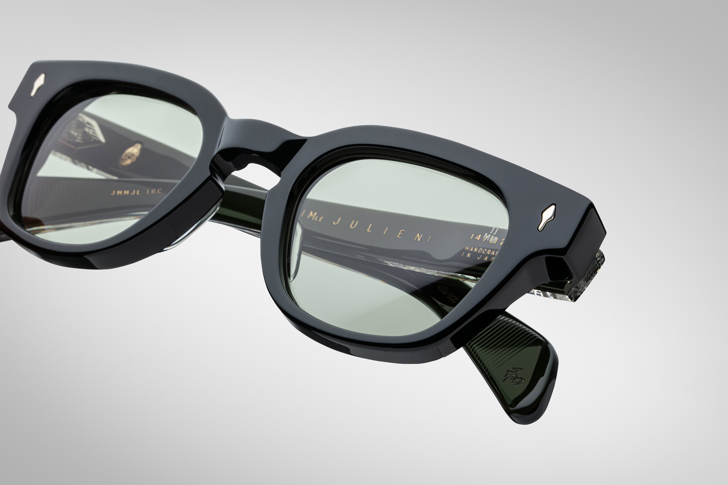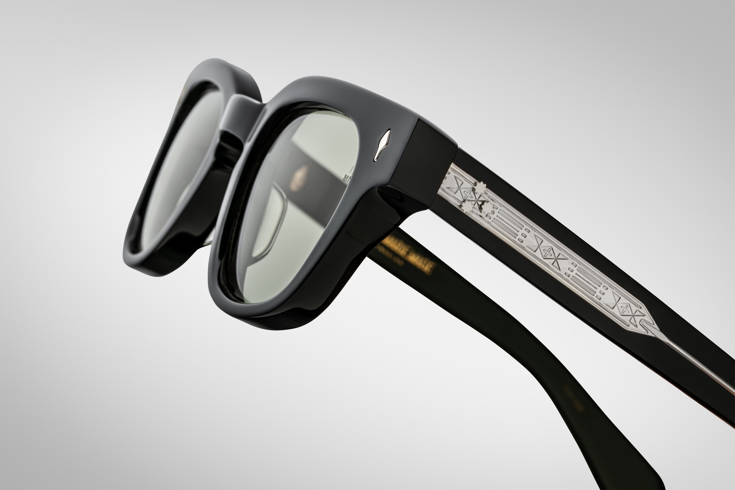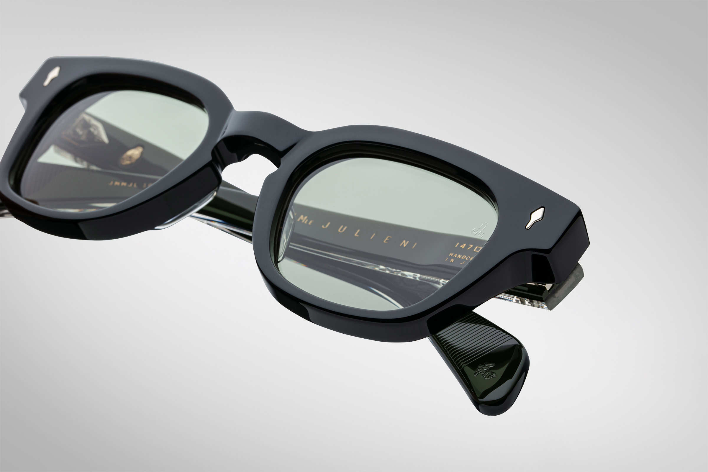 Moderate Wellington-shaped spectacles with keyhole bridge, this “jazz silhouette” especially suited for small to medium faces features custom-double-laminated temples and our signature precious metal details.