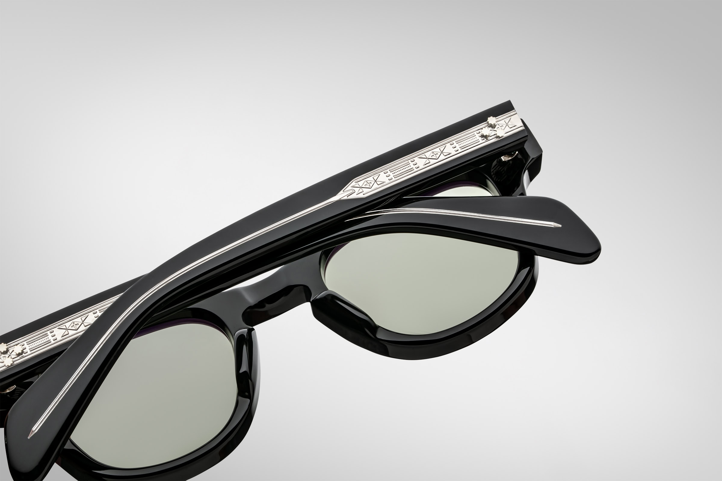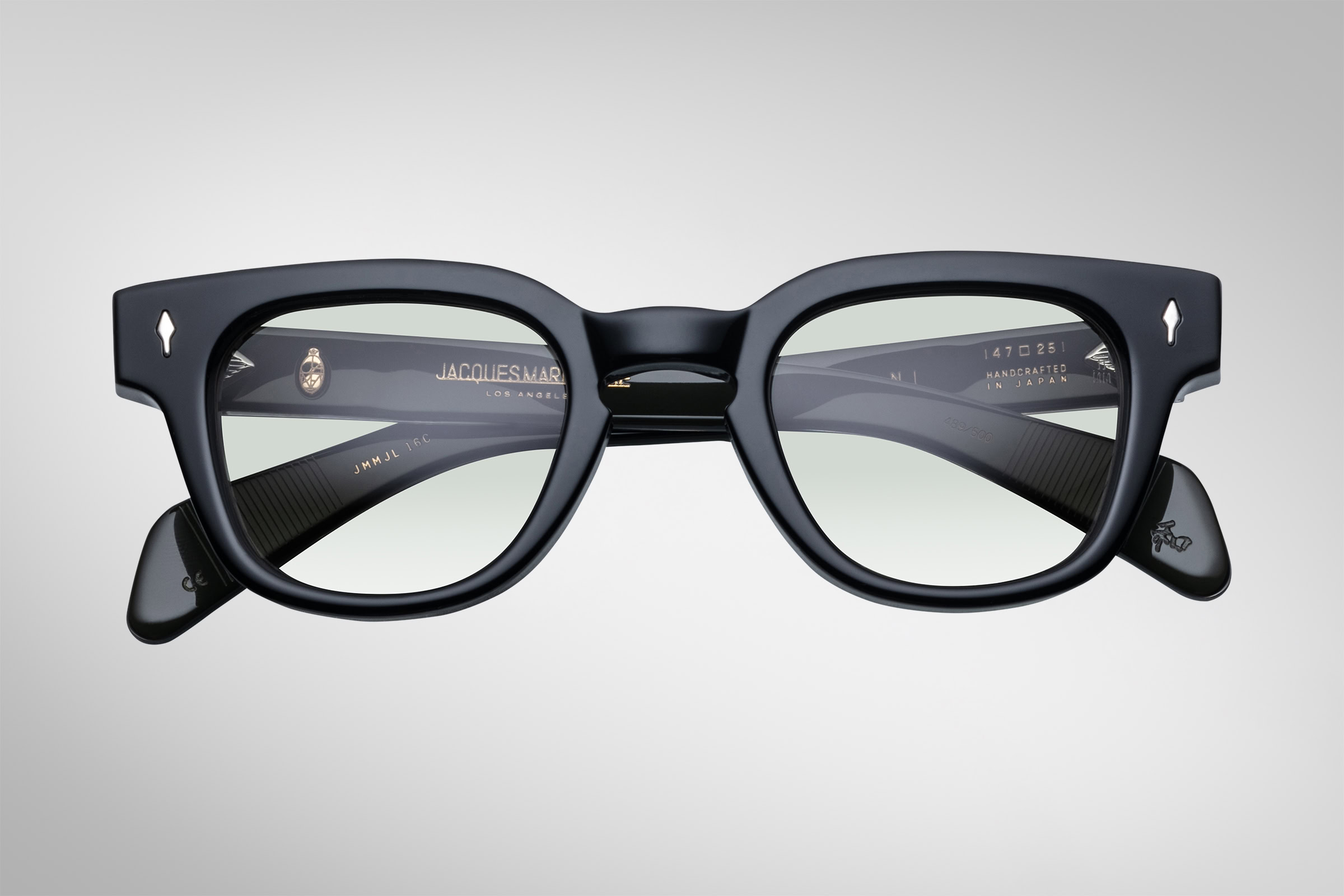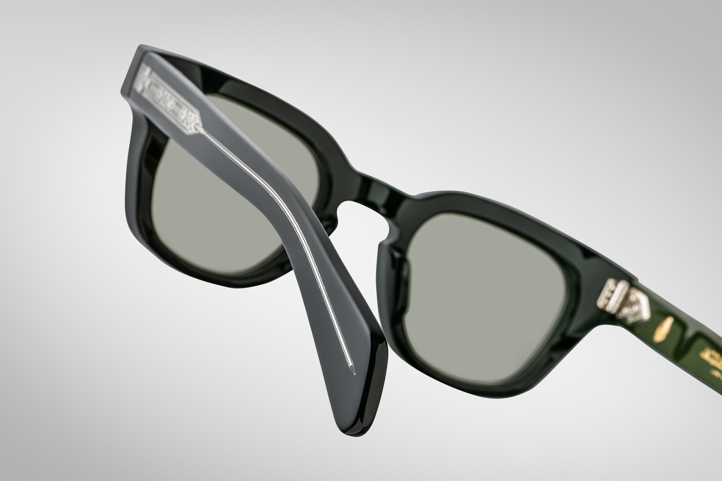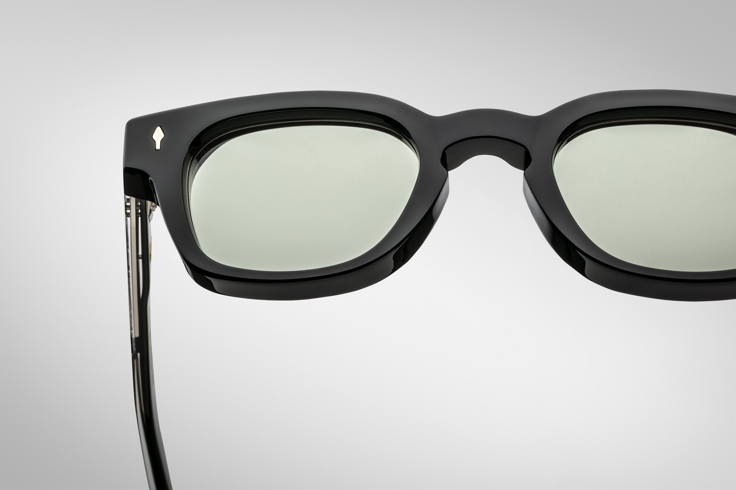 Moderate Wellington-shaped spectacles with keyhole bridge, this “jazz silhouette” especially suited for small to medium faces features custom-double-laminated temples and our signature precious metal details.