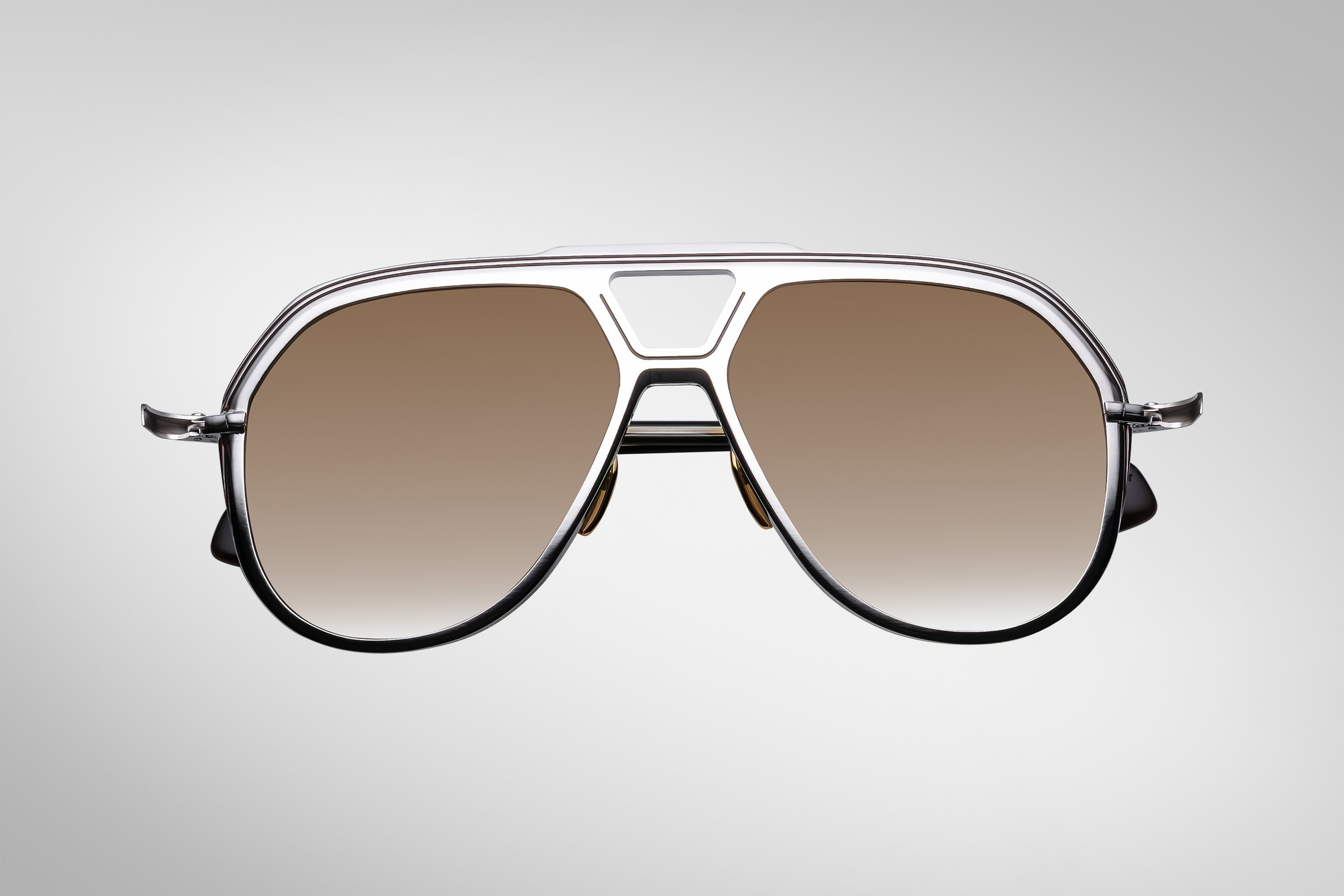 Classic, late-seventies-inspired aviators in titanium with sculptural acetate temple tips, featuring a V-shaped profile, distinctive double-bridge and temples with dual-tone embellishments and hairline epoxy details.