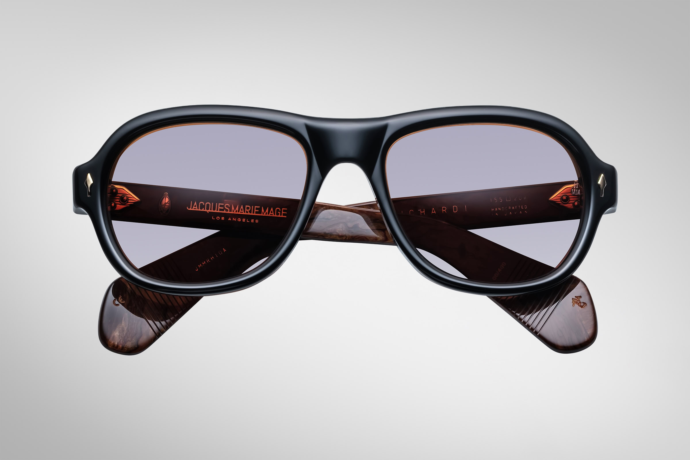 Mid-sized sunglasses with a modern aviator shape, hand crafted with JMM’s signature double-arrowhead front pins and comfortable ‘spatula’ temple.